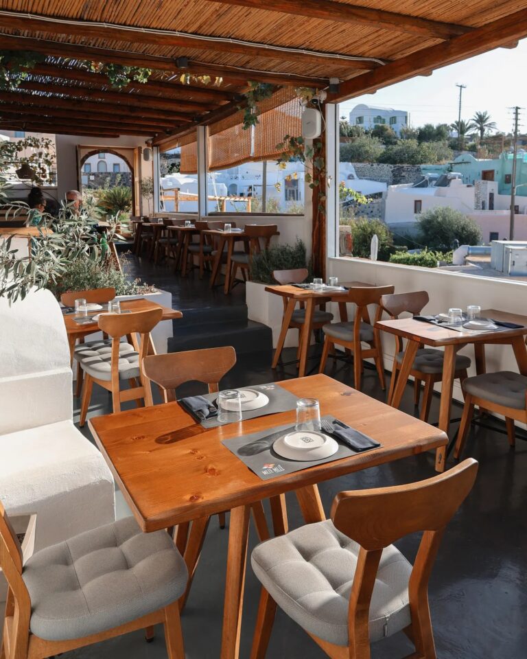 Housed inside a restored captain’s home along a quiet lane in Oia, this multi-functional venue embodies island hospitality through food, art, and community. Founded by people passionate about art, culture and Santorini’s traditional way of life, the space also hosts artists who leave behind works displayed throughout the venue. Diners enjoy Greek dishes crafted from succulent ingredients and Santorini wines, immersed in an authentic environment reflecting the island’s cultural heritage.