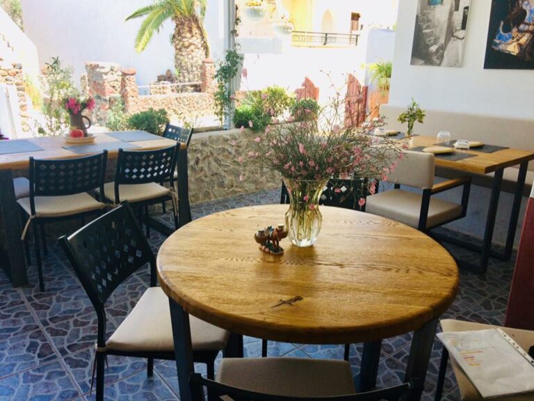 With a history spanning a century, Aktaion stands out as one of Santorini’s premier dining establishments. This charming taverna offers a cozy setting where visitors can enjoy traditional dishes at fair prices. Notable menu items include shrimps in zucchini rolls, stuffed vine leaves with creamy lemon sauce and traditional ‘Kalogeriko’ homemade pasta with tomato sauce, capers, garlic and caper leaves. The limited outdoor seating provides enchanting views of the caldera. The taverna’s third-generation proprietor, Vangelis Roussos, is also an artist, and his wood carvings and paintings add a personal touch to the intimate, whitewashed interior.